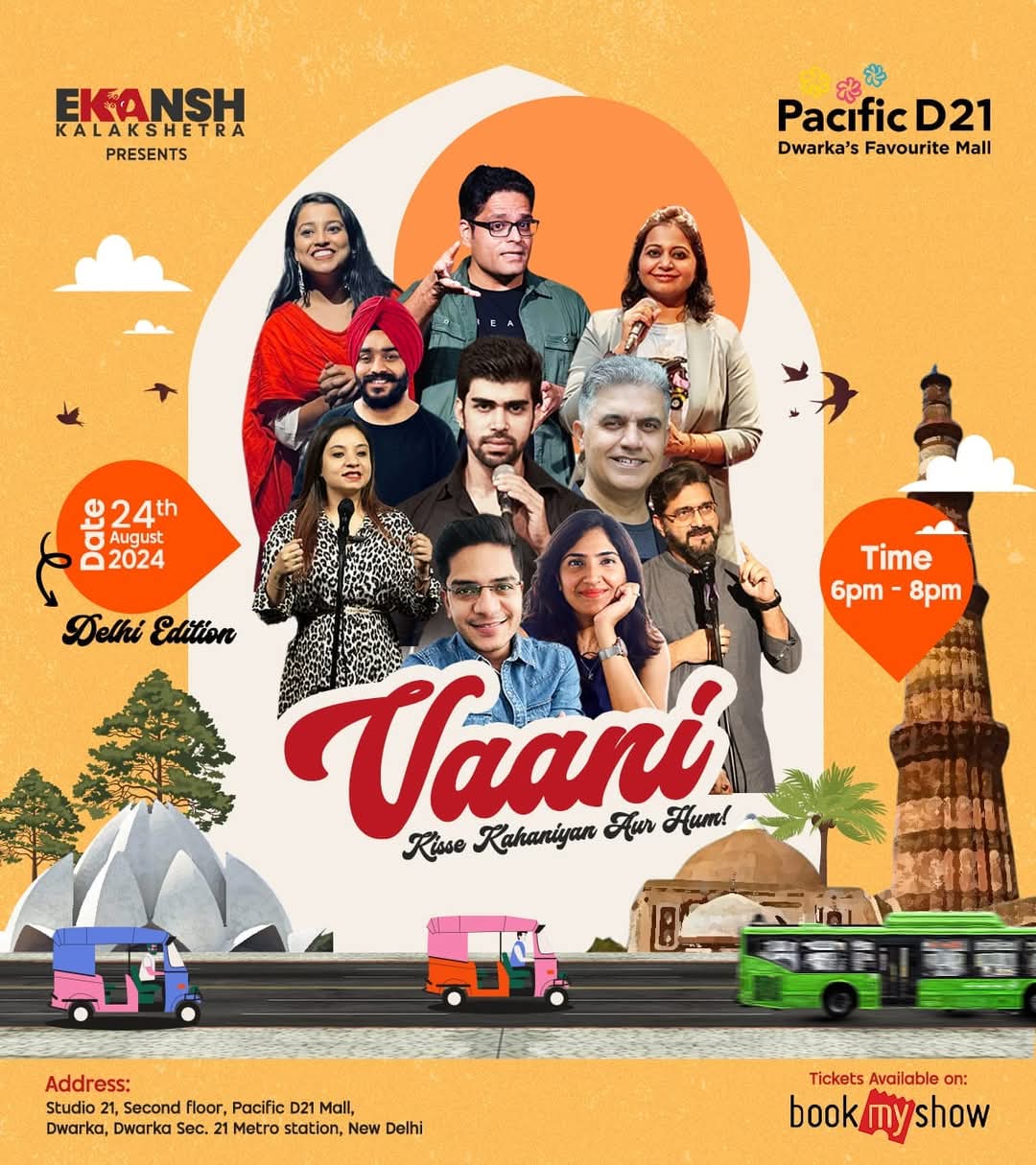 The Ekansh Kalakshetra bandwagon goes to Delhi for its 9th edition of Vaani: Kisse, Kahaniya aur Hum, a show brought to life by Ekansh Kalakshetra Productions. This show brings together the finest storytellers from Mumbai and Delhi promising the audience an unforgettable evening. To not miss the spectacle , Join us for the show in Delhi on 24th August at Pacifica D21 mall.