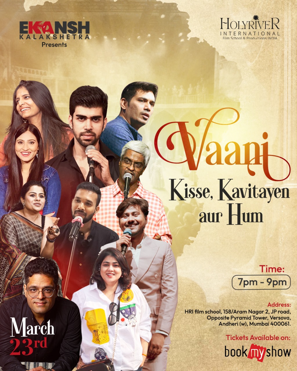 HRI Film School, Mumbai MaharashtraThe 5th edition of Vaani: Kisse, Kahaniya aur Hum presented by Ekansh Kalakshetra brings the first ever poetry-special to you. The evening promises a unique blend of poetry and life experiences spun with love and brought to you by the best poets from the industry. Do Join us for the show on 23rd March.