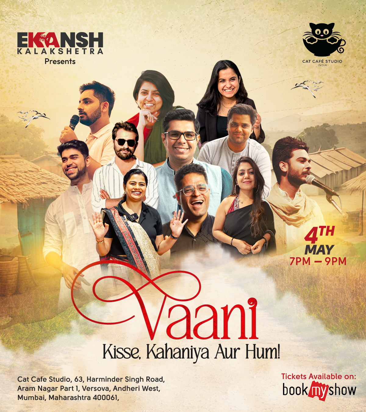 Catcafe Studio, Mumbai MaharashtraEkansh Kalakshetra brings to you the 6th edition of Vaani: Kisse, Kahaniya aur Hum, a show brought to life by Ekansh Kalakshetra Productions. The evening promises narratives spun with love laughter and life experiences . Do Join us for the show on 4th May.